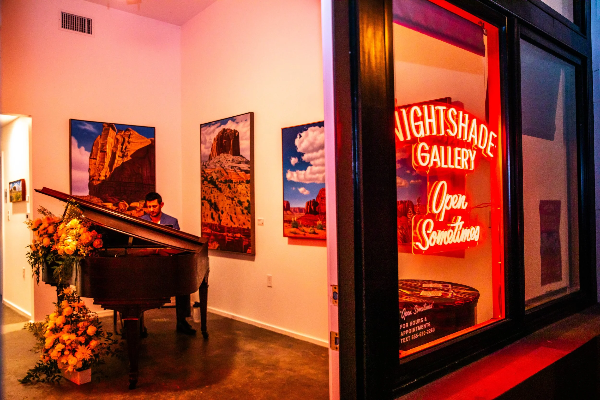 Tucked away in the heart of Lockhart, Texas, Nightshade Gallery is a curated space for art, music, and community. Step inside and you’ll find a room that feels equal parts gallery, PIANO LOUNGE, and speakeasy, glowing softly under a red neon light. You won’t stumble in by accident - you have to know where to look.